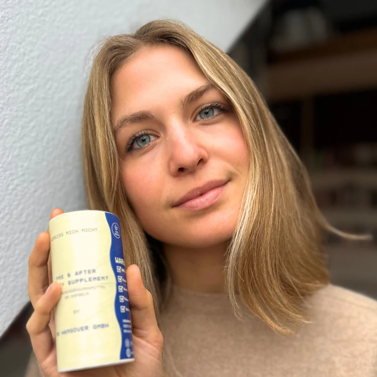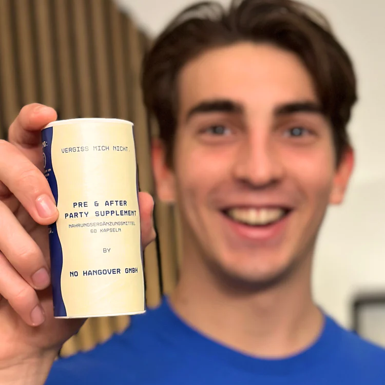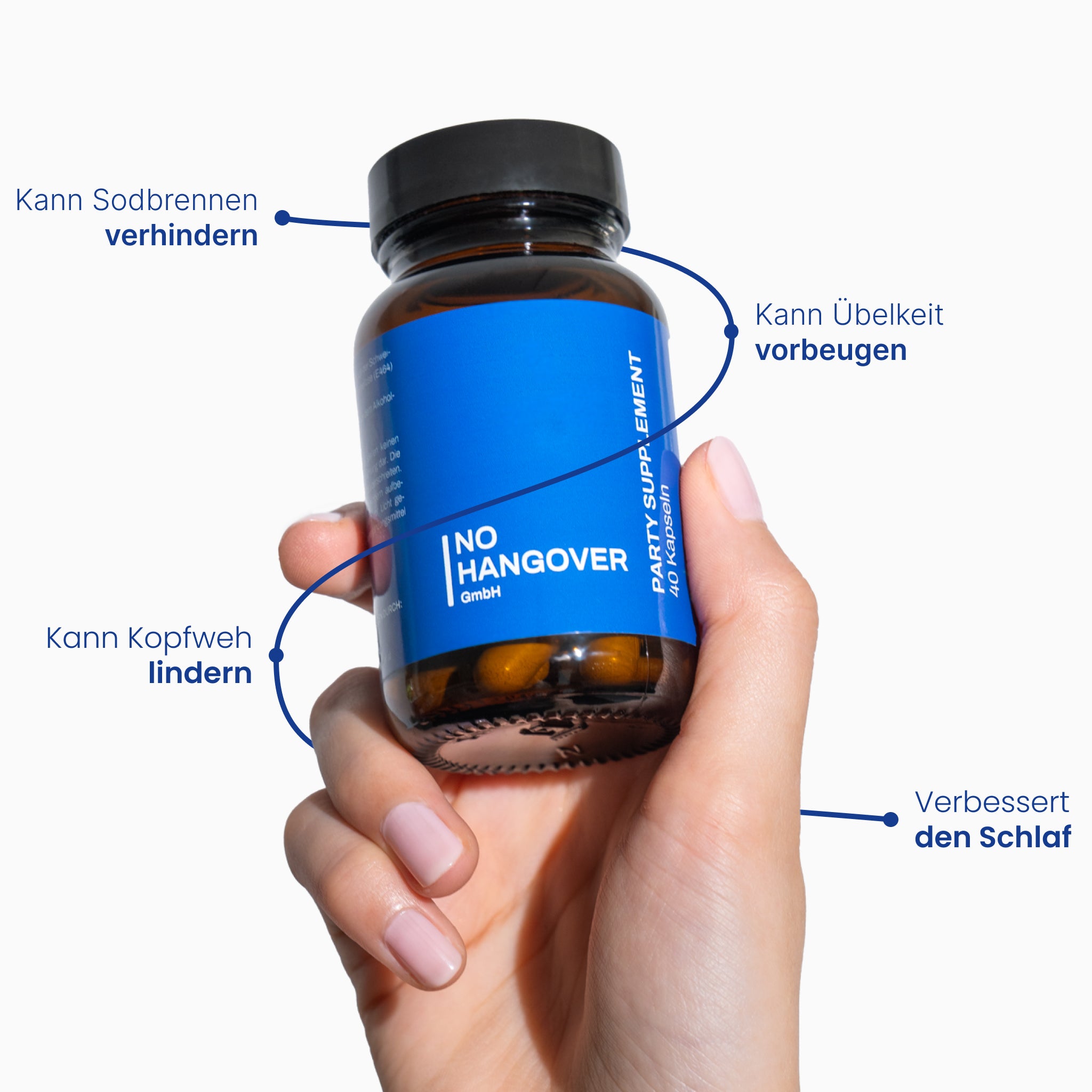 Nach dem Feiern nimmst du 2 weitere Kapseln ein. Die Kapseln unterstützen die schnellere Ausscheidung von Abbauprodukten und können dabei helfen Katersymptome zu lindern.